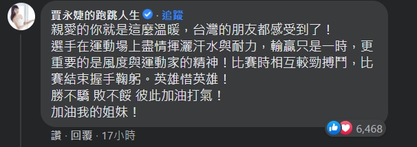 賈永婕3日在小S的臉書貼文底下留言表示關心,「親愛的,妳就是這麼溫暖,台灣的朋友都感受到了!」接著提到選手在運動場上盡情揮灑汗水與耐力,比賽輸贏只是一時,重要的是風度與運動家精神,在比賽結束後選手彼此握手鞠躬,是英雄惜英雄,文末更高喊,「勝不驕,敗不餒,彼此加油打氣!加油我的姐妹!」希望小S不要受到網友們的留言打擊。