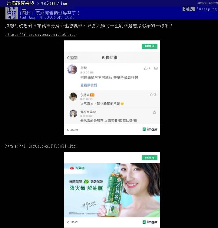 最近有網友在PTT以「原來柯佳嬿也辱華了!」為標題,吸引諸多網友們的注意,並在內文中提到,「沒想到原來代言分解茶也會乳華,果然人類的一生,乳華是無法逃離的一環啊!」還附上中國網友微博留言的截圖,讓大家了解為什麼柯佳嬿會無緣無故被抓代言有辱華嫌疑,因為在代言廣告中有出現「國家認證」這幾個字,意外引發陸網討論。