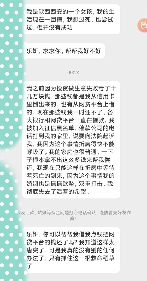 此外,劉樂妍也提到自己現在居住的河北燕郊有個新社區,在5年前因房價很高,不少人在那裡購屋,沒想到在2021年房價整個直接腰斬,讓不少買房的屋主們想跳樓尋死!而她自己最近則是收到疑似詐騙的訊息,有一位女生向她表示,自己住在西安,投資失敗負債數十萬,導致婚姻瀕臨破裂,一直不斷強調自己真的不是騙子,希望劉樂妍可以幫幫她。