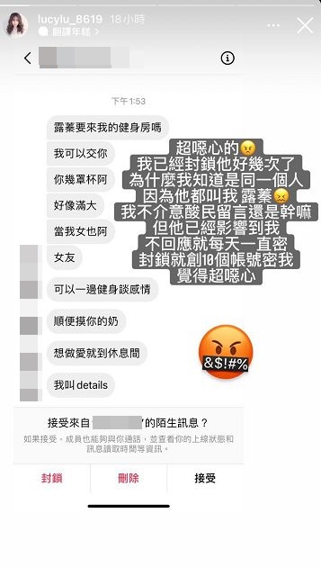 Lucy經常在社群平台分享日常,日前她在限時動態中,無碼公開騷擾訊息,只見對方不斷邀請Lucy去健身房,同時還腦補小劇場「可以一邊健身談感情,順便摸你的X,想做愛就到休息間」。對此Lucy直言非常噁心,「我不介意酸民留言還是幹嘛,但他已經影響到我,不回應就每天一直密,封鎖就再創帳號,覺得超噁心」!