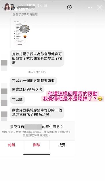 Lucy直接公開騷擾私訊,對方終於道歉,稱自己誤會想歪,不過仍繼續要求見面道歉,直呼自己會穿西裝騎腳踏車等她,並送上99朵玫瑰花。Lucy對此則無奈表示,「他這樣回覆我的限動,他是不是壞掉了」?