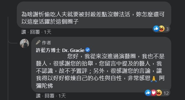 對此,許藍方也正面回應,表示:「很感謝您的抬舉,您留言中提及的藝人,我不認識,故不予置評;另外,很感謝您的言論,讓我得以好好修煉自己的心性與自性」,自於被網友奉勸要遵循道德規範的留言,她則解釋,當時的貼文是看完書後的心得,提醒對方了解事情全貌再發言:「否則您與您在這裡的存在就會被我封鎖」,引發熱議。