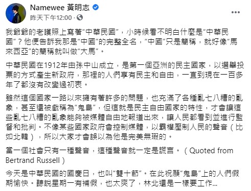 黃明志更暗諷「不像某些國家政府會控制媒體,以霸權壓制人民的聲音(比如北韓),所以大家才會誤以為他是完美無瑕的」,並引用哲學家羅素的話,強調「當一個社會只有一種聲音,這種聲音就一定是謊言」,並祝福「鬼島」上的人們假期愉快。聽說星期一有補假的他更羨慕表示「也太爽了,林北還是一樣要工作」,貼文曝光後立刻引發網友熱議。