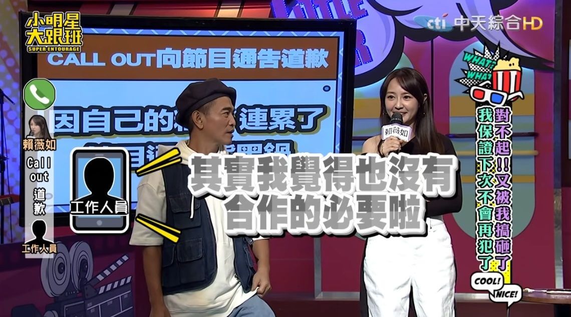 在整段通話過程中,現場所有人聽了也都忍不住直呼,「好尷尬!」還好賴薇如再一次主動低頭道歉,讓她和那位工作人員順利和解,對方也答應日後有機會願意再合作,一旁的吳宗憲聽完也跳出來緩和氣氛說,「圈內人大家都可愛啦!後來人家也願意發她通告了~」。