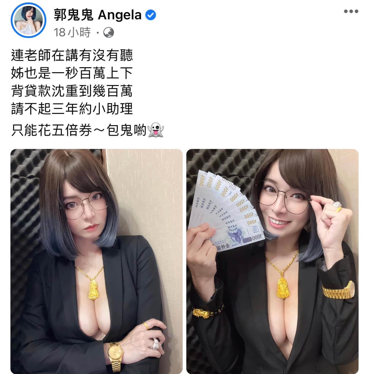 對此,擁有火辣G杯的郭鬼鬼,也在臉書發文曬照,從照片中可以看到,她身穿黑西裝外套、裡面沒穿任何衣服,大方露出深V,展現圓潤飽滿的胸型,身上也配戴了許多誇張金飾,手抓大把鈔票,她也在貼文中寫道,「連老師在講有沒有聽,姊也是一秒百萬上下,背貸款沈重到幾百萬,請不起三年約小助理,只能花五倍券~包鬼喲!」似乎是針對槓上鄧佳華一事做出回應。