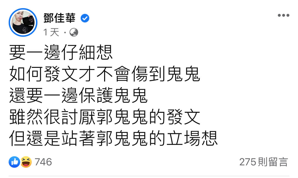郭鬼鬼最近到連千毅的社群平台上抱怨,說鄧佳華經常會在社群發文,對女性相當不禮貌,希望連董可以管一下,並提醒連千毅凡事按照規矩來,「現在他很大型,讓他知道,要轉型不能只有嘴巴說說!」後來鄧佳華似乎不滿自己被控訴騷擾,再度在社群上發了一段影片喊話說,「我是哪裡騷擾到你了? 」並要求女方具體說清楚,但沒多久之後又發文致歉。