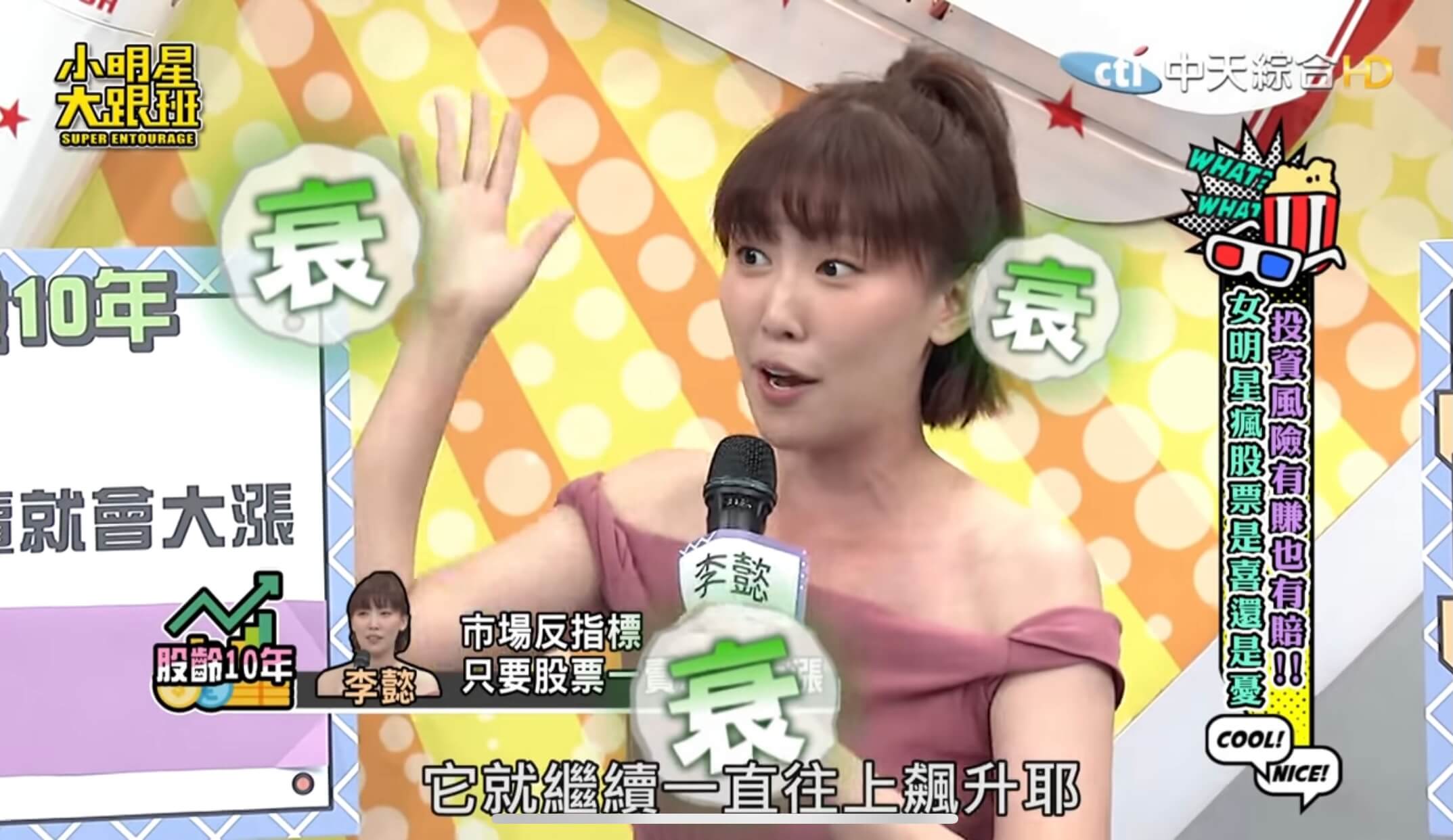 而李懿也自嘲自己是「股票反指標」,只要她賣掉手上的股票「一脫手就回漲」,她無奈苦笑的說,「那陣子一直被我朋友笑說『妳什麼時候要賣』」,這樣大家就會先去買,常常被朋友笑稱是「冥燈」,她一邊激動地分享過程,胸口也一邊跟著漲紅,讓主持人Sandy幽默笑說,「氣到胸前一片紅!」。