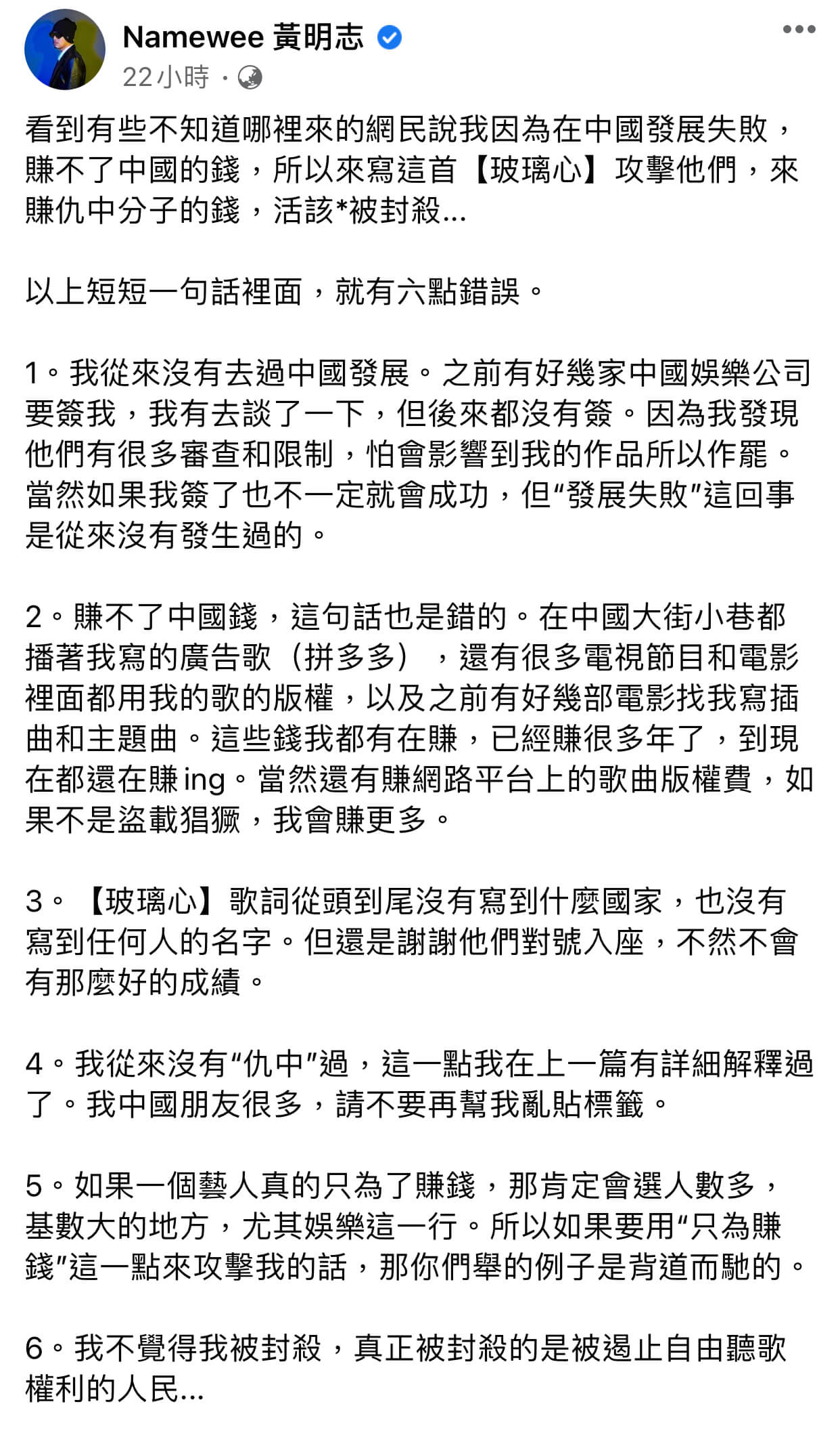 黃明志28日在臉書發文反駁酸民,因為他看到有網友認為他寫這首《玻璃心》,是因為他在中國發展失敗,所以才寫歌攻擊中國,試圖賺取仇中份子的錢,而且網友還酸黃明志「活該被封殺」!看到網友的言論後,黃明志也列出6點反駁聲明,他表示,自己從未到中國發展,過去有幾家中國娛樂公司要簽他,但因為發現對方有很多審查和限制,怕影響到作品所以放棄機會,「當然如果我簽了也不一定就會成功,但『發展失敗』這回事,是從來沒有發生過的」。