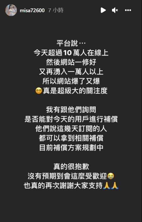 此外,米砂進一步透露,「平台說今天超過10萬人在線上,然後網站一修好,又再湧入一萬人以上,所以網站爆了又爆」,對於許多人權益受到影響,平台也已經在商討補償措施,最後她感動表示:「有你們的支持,我才能繼續做出更多好作品!雖然還有很多進步空間,但有你們在我身後,絕對可以越來越好的!」。