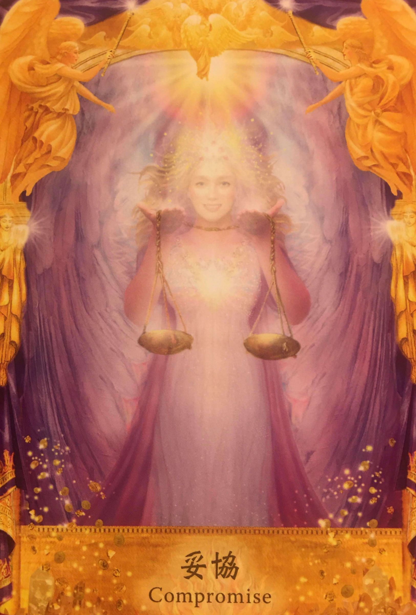 抽到這張牌,代表天使對你近期煩惱的提醒是:為了替目前情況創造愉快的結果,妥協是必要的。給你自己一點時間,搞清楚什麼才是真正對你重要的優先順序。同時留意,如果你需要改變立場的話,請先思考哪個方向才是對每一個人都有利呢?對眾人的合作保持開放性,這將幫助你得到想要的結果,同時也協助對方滿足他們的期待。對目前狀況保持客觀,尊重每個人的觀點,更重要的是,請對你自己誠實,在這兩者之間一定能找到平衡,創造雙贏吧!