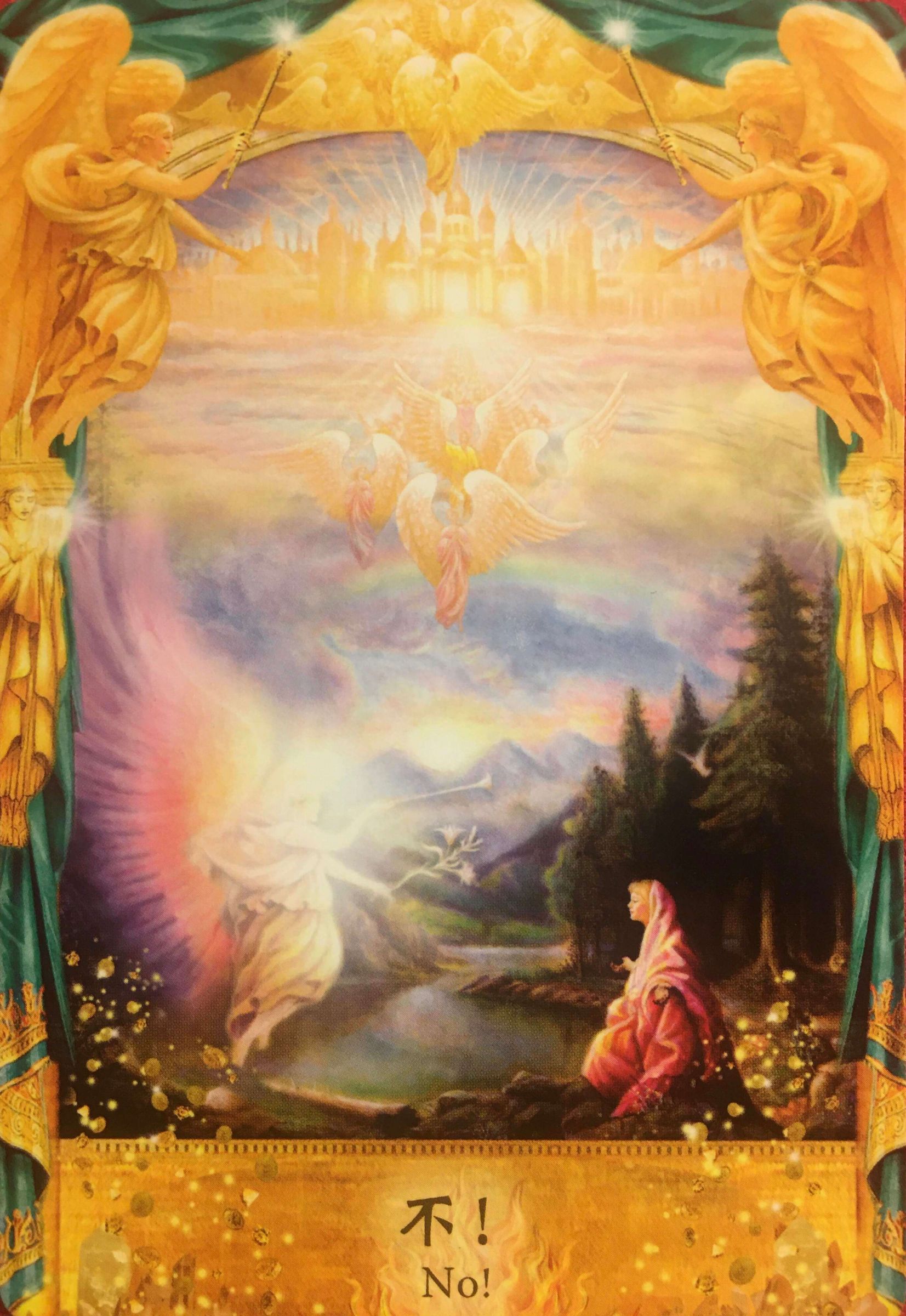抽到這張牌,代表天使對你近期煩惱的提醒是:你所問的這件事,天使的回應是「絕對不行!」但是,你不需要擔心,過一段時間,你很快就會知道為什麼這是一個適宜的答案。牌面上的人看起來面對的是一個童話般的場景,有寧靜的湖面、悠遠的山巒、蒼鬱的森林,前方還有天使吹奏聖樂,更遠處有彩虹,虹光上還有一群天使,最上方彷彿是天堂的聖光壟罩,一切看來都非常美好……但是,很多事情不能只看表象,請再給自己多點時間等待全貌。