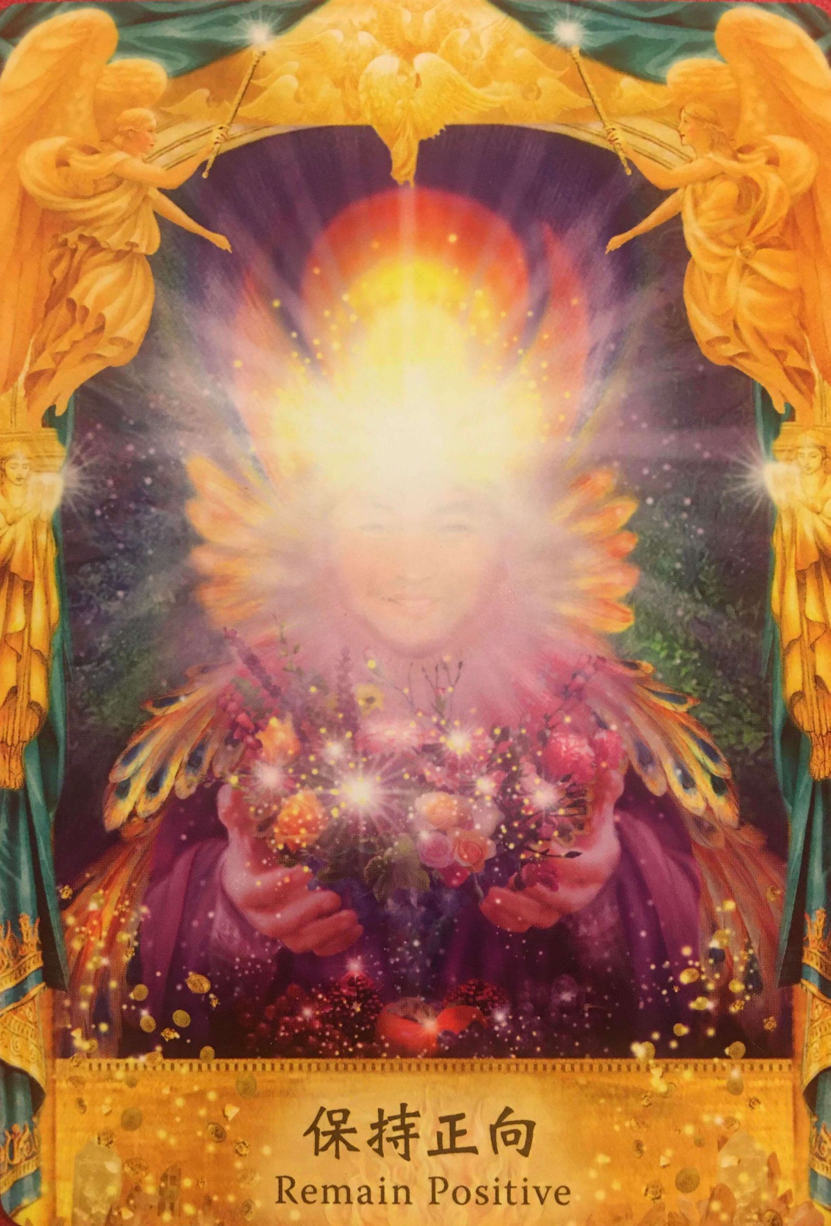 抽到這張牌,代表天使對你近期煩惱的提醒是:關於你所期望實現的事情,現在有一個非常積極的氣勢正在形成,請保持正向樂觀、愉快自信的態度,你的夢想將會加速實現!雖然看起來過去你已經花了很長一段時間,計畫卻還沒實現,不過你很快就會看到轉變。在你夢想即將成真的時刻,絕不要讓自己失去盼望!牌面上的天使笑容滿面,頂輪散發出耀眼炫目的白光,象徵天使賜福給你的智慧靈光,雙手捧著閃亮的花朵,為你帶來值得慶祝的消息!