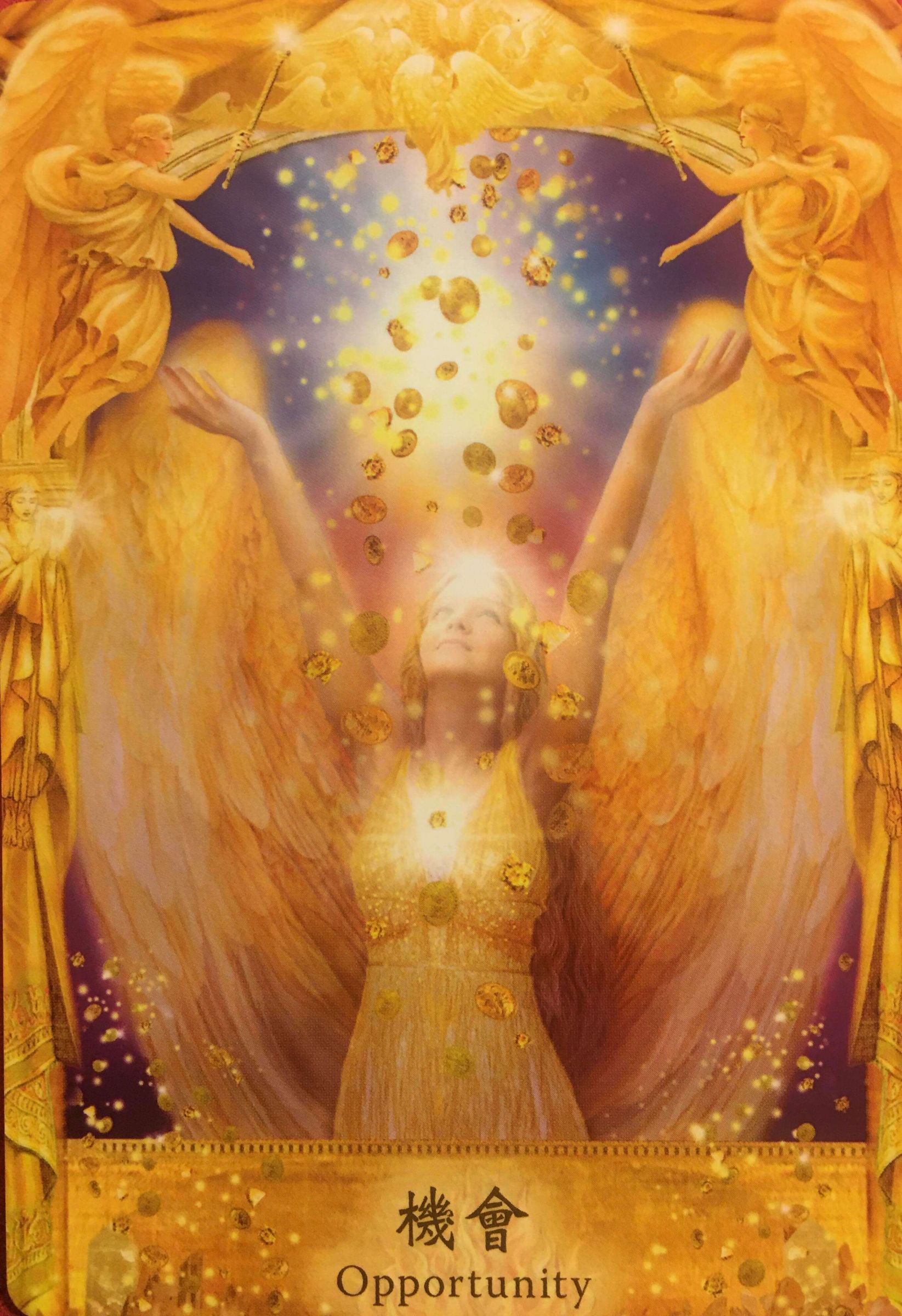 抽到這張牌,代表天使對你近期煩惱的提醒是:把握機會!正面成長和拓展即將到來。這個機會將帶來靈感或洞見,如果你早就有一些點子想要實現,那麼你等待己久的時機已經到來了。牌面上穿著金色禮服,擁有金色雙翼的天使,正敞開心胸和雙手,滿懷期待的迎接無限可能的到來,象徵靈感帶來機運,如果你正在尋找時機想要轉換職業、找新工作、創業、談戀愛,不管你渴望什麼,天使都即將為你開啟一扇充滿可能性的大門。勇敢的踏進去吧!