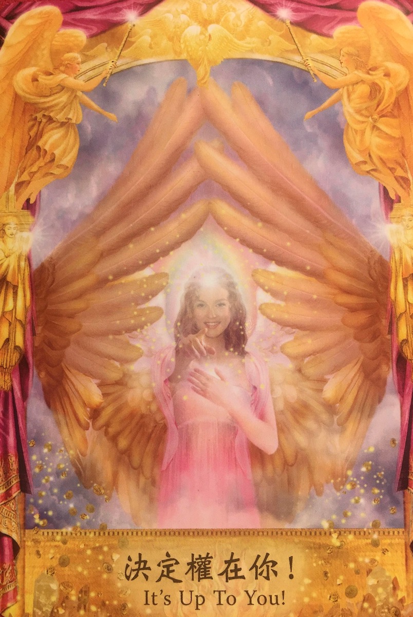 抽到這張牌,代表天使對你近期煩惱的提醒是:你所問的這個狀況,最後結果的決定權完全在你手上!現在解決問題的重點在於積極的行動,你可以影響整件事情的走向及結果。帶著自信發揮你的力量,事情就會有圓滿的結局。不要等待別人來搶走主導權,或者帶走節奏,為了讓結局成功圓滿,現在就是你貢獻自己獨特見解和經驗的時刻!牌面上天使展開巨大金色的雙翼,帶來強大的保護勢能,也為你強大的行動力加持,掌握機會並採取行動,go go!