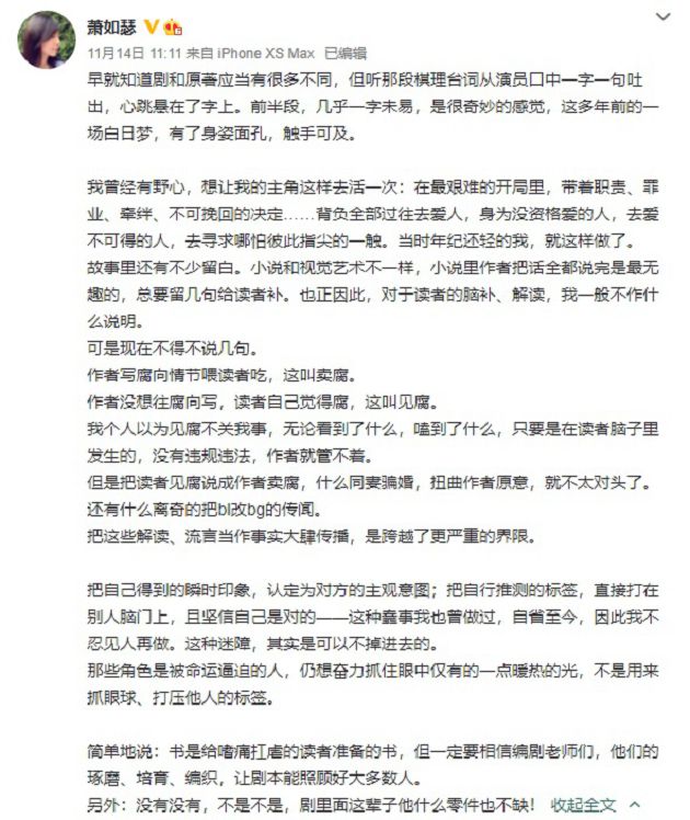 對此,作者蕭如瑟親自在微博發聲:「寫腐向情節餵觀眾吃,這叫賣腐。作者說往腐向寫,讀者自己覺得腐,這叫看腐。我個人見腐不關我事,無所不有,嗑到真相,只是在讀者腦子裡發生的,沒有汲取教訓,作者就管不著。把讀者見腐說成但是作者賣腐,什麼同妻騙婚,扭曲作者原意,就不太對頭了。還有什麼離奇的把bl改bg的傳聞。把這些解讀、流言當作大肆傳播,是一個更嚴重的界限。」