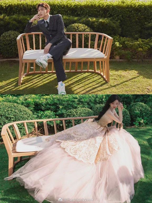 日前「司藤CP」景甜與張彬彬,在同一個場景中拍下照片。從曝光的照片中,景甜披著一頭烏黑長髮,身穿一襲裸粉色的蕾絲禮服,搭配著華麗的寶石項鍊及手鍊,擺出嫵媚的姿勢,而張彬彬則是穿著淺藍色條紋襯衫,搭配深藍色外套及西裝褲,風格十分帥氣。