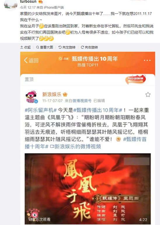 如今《後宮甄嬛傳》已推出十周年,當年參與其中的演員也紛紛在微博發文回憶。其中,孫儷就發文表示:「家裡的少女給我發來圖片,說今天甄嬛播出十年了……我一下就在想2011.11.17我在幹什麼~我在坐月子,應該是剛出院回到家,對著新生命新手忙腳亂,然後鄧先生和我說實在不行我們再回醫院去吧!初為人母有很多不適應,如今孩子們已經可以和我視頻聊天了」。
