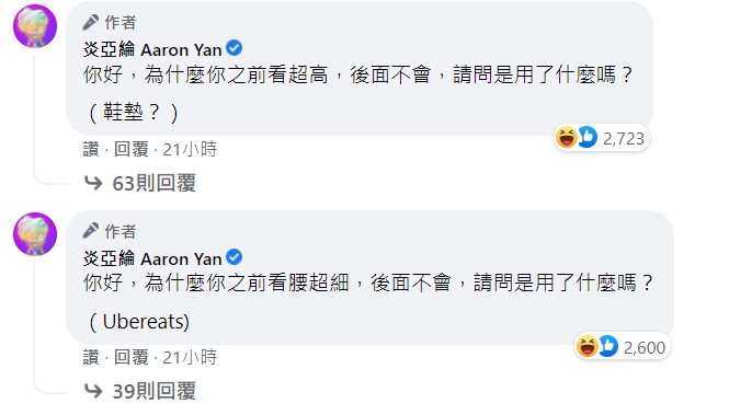 更有趣的是,炎亞綸在留言處玩起照樣造句,他幽默寫下:「你好,為什麼你之前看超高,後面不會,請問是用了什麼嗎?(鞋墊?)」、「你好,為什麼你之前看腰超細,後面不會,請問是用了什麼嗎?(Ubereats)」,爆笑反應讓網友讚聲一片,忍不住笑回:「這好像是男藝人的祕密!」、「誰准你照樣造句」。