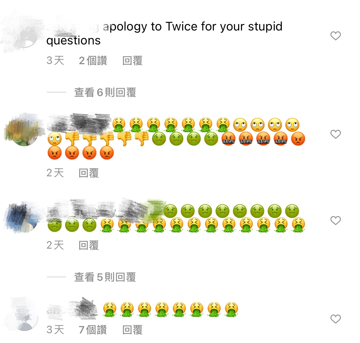 事後朴明洙看見Melon排行榜時,趕緊緩和當時氣氛,表示「哇,排名很前面,果然名不虛傳。」但是這一連串對話,讓身為TWICE的忠實粉絲怒氣沖天,不滿地湧入朴明洙IG瘋狂洗版,給予負評「竟敢對多賢和子瑜無禮」、「跟子瑜和多賢道歉」、「提這什麼爛問題」,引發熱議。