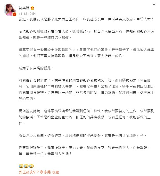 不過話鋒一轉,她提到自己最近實在太忙,不僅被拖欠工資,就連抖音帳號也被盜,讓她無奈坦言「我費盡千辛萬苦找了律師,還千里迢的回到湖北恩施宣恩縣報警,奔波來回一趟花了非常多的時間、精力跟錢」,更直言「反台獨支持統一這件事情沒有幫助我賺到任何一塊錢。我依然要努力的工作,依然要到處的接活」。