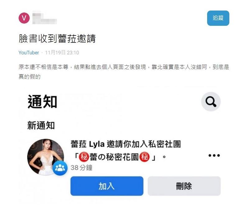 知名Youtuber團體「反骨男孩」,其中成員蕾拉,直白、火辣性格,吸引不少粉絲熱愛,時常於個人頻道「我是蕾拉」,記錄私底下的生活點滴。日前一名網友在社群分享出被蕾拉邀請加入私密社團的通知,讓她驚訝不已,直呼「到底是真的假的?」掀起熱議。