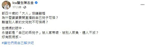 對此,重症醫師陳志金在社群發文寫道,「都四十歲的『大人』協議離婚,為什麼婆婆要開直播說自己兒子可憐?難道別人家的女兒就不可憐嗎?」他也直言,「在媽媽的眼中,永遠都是『自己的乖兒子』被人家帶壞、被別人欺負、遇人不淑?好有既視感~」。