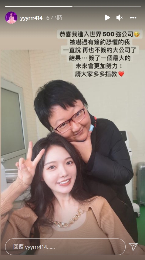 接著,她曬出一張與工作人員的自拍照,開心表示,「恭喜我進入世界500強公司」,她坦言過去與大公司簽約時有過不好的回憶,甚至揚言「再也不簽約大公司了」,沒想到如今竟簽了一個世界級的公司!最後,她也展現出決心,「未來會更加努力!請大家多多指教!」令粉絲期待她與新公司能夠擦出更厲害的火花。