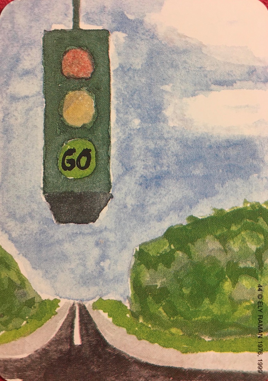 真心話:請誠實的回答:「你想來一場說走就走的旅行嗎?」「你是不是很想辭職,或者逃離目前的生活?」「你渴望無拘無束的生活,不再遇到卡關?」「是什麼絆住了你的腳步,導致你覺得無法啟程?」「如果可以放下一切立刻出發,你會想去哪裡?」選到這張牌,或許是在提醒你,你的潛意識嚮往蔚藍的天、蒼鬱的綠樹、筆直的大道,加上一路綠燈的暢快,好讓你在生活中無往不利、通行無阻。道路的盡頭通往自由?還是夢想?唯有出發才知道。