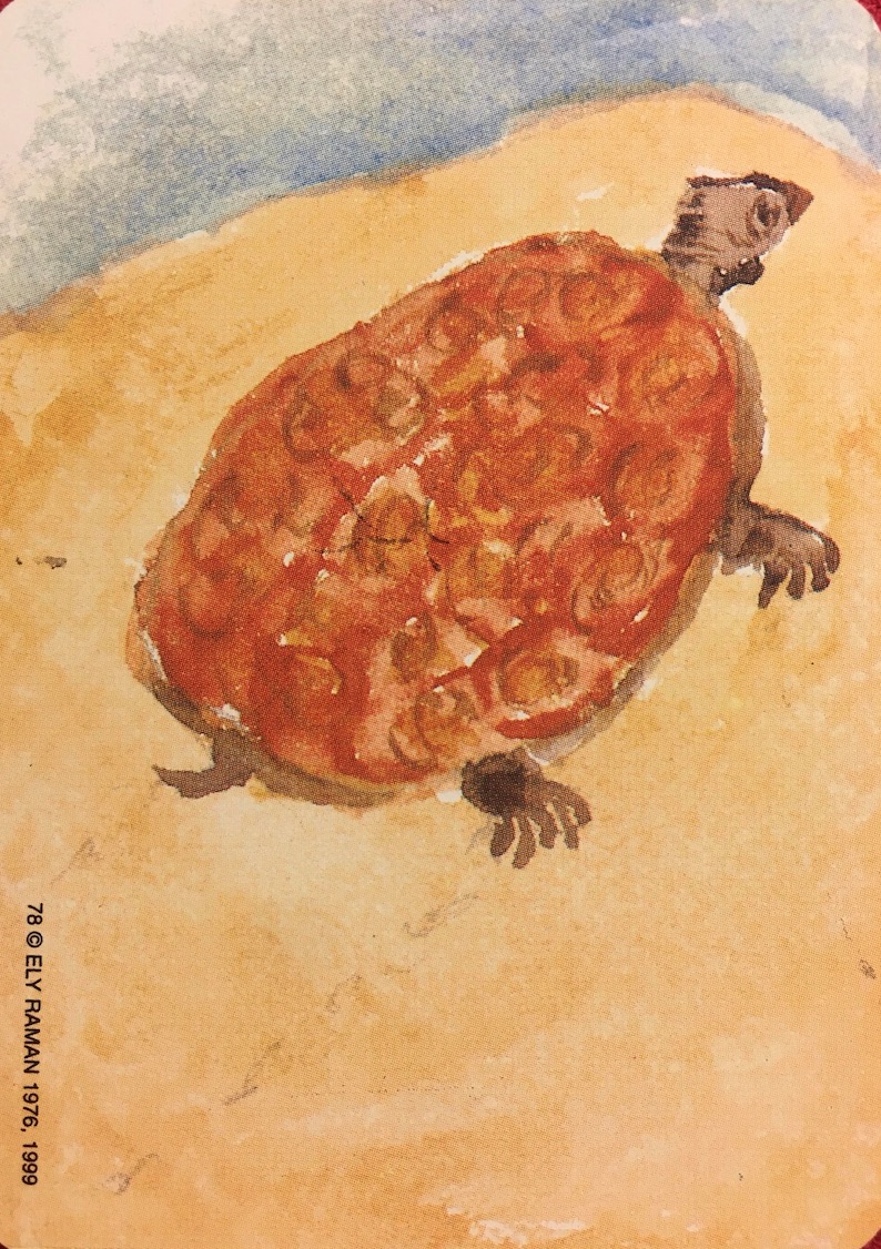 真心話:請誠實的回答:「你想當隻悠閒漫步海邊的烏龜嗎?」「你有多久沒去海邊度假了?」「你的生活步調目前是太快了,還是太慢了?」「烏龜的龜殼對你來說,是保護的盔甲,還是沉重的負擔?」「你想回家嗎?」選到這張牌,意味著你的潛意識想提醒你有關生活步調的問題,你目前的狀況是節奏太快,卻逐漸跟不上,只想龜步慢爬;還是步調太慢,享受這種悠閒和自在呢?烏龜速度雖慢,卻步步紮實,告訴自己每一步都算數,你可以的!