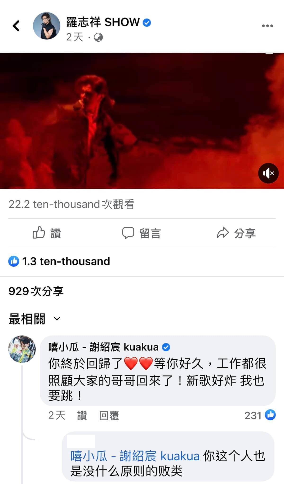 而男星嘻小瓜也大方在他的社群平台底下留言表示,「你終於回歸了!等你好久,工作都很照顧大家的哥哥回來了!新歌好炸,我也要跳!」可以感受到嘻小瓜對羅志祥回歸一事感到非常興奮且開心。不過,留言一出也馬上遭到不少酸民抨擊,甚至還有網友直接點名他嗆聲,「你這個人也是沒什麼原則的敗類!」