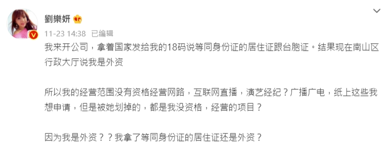 劉樂妍23日在微博發文,表示自己想在中國開設經紀公司,但卻遭到中國官方拒絕,因為官方認為她是外資,害得她無法正常經營演藝事業!她也透露,自己領有居住證、台胞證,居然還要透過他人才能設立個人公司,十分不方便。隨後她又表示,自己查了林志玲在中國設立的公司,公司經營範圍不包括「演出經紀」,她雖然對於這樣的經營範圍正當性抱持著懷疑態度,但她也決定要以此為範本再去申請一次看看。