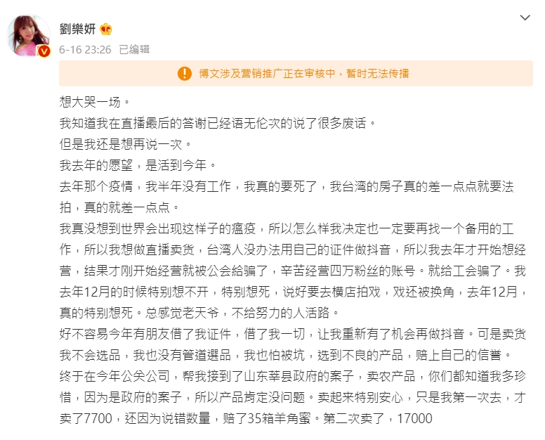 事實上,劉樂妍已在中國發展多年,可是演藝事業始終不見起色,她也曾在微博大吐苦水,坦言自己也受到疫情影響,長達半年沒工作,原本經營的抖音帳號也被騙走,所以沒辦法賺錢,甚至連拍戲都被換角,讓她崩潰直呼,「差點要死了!」之前也曾因為她太久沒回台灣處理生活事務,害自己在台灣的房子差點被法拍,讓不少網友都嘲諷她是「舔共失敗的藝人」。