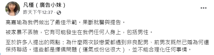 高嘉瑜被男友林秉樞家暴,事隔19天告上法院,事情立刻躍上檯面,而廣告小妹在臉書上發表看法,她對高嘉瑜「果斷就醫與提告」的行為表示佩服,並稱讚高嘉瑜是「為我們做出了最佳示範」,她也呼籲大家被家暴並不丟臉,「它有可能發生在我們任何人身上,包括男性」,希望大家都可以小心安全。