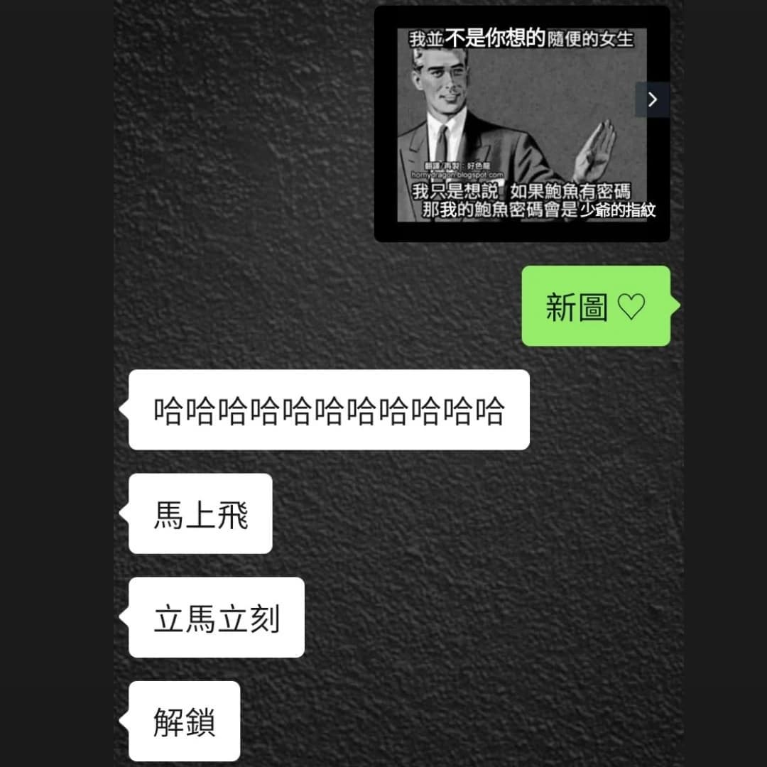 只見對話紀錄中,Keanna先是貼了一張梗圖,上面寫道:「我並不是你想的隨便的女生,我只是想說,如果鮑魚有密碼,那我的鮑魚密碼會是少爺的指紋」,大開18禁玩笑,男友則笑回:「馬上飛!立馬立刻解鎖」,感覺得出來水瓶少爺已經被挑逗的心癢癢,恨不得馬上到Keanna身邊享受魚水之歡!