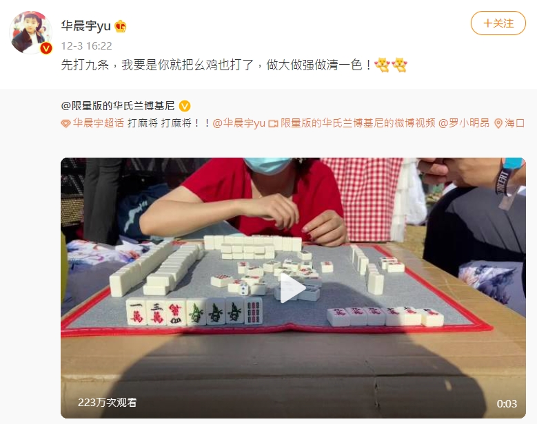 隨後,該粉絲再度分享華晨宇的貼文,並邀請偶像一同參與,「下來啊,三缺一。給你留個位置!我們來做大做強」,有趣的是,按照華晨宇的指導,結果真的胡牌了,看來華晨宇不是僅歌唱得好,就連麻將也是能摸出一手好牌。
