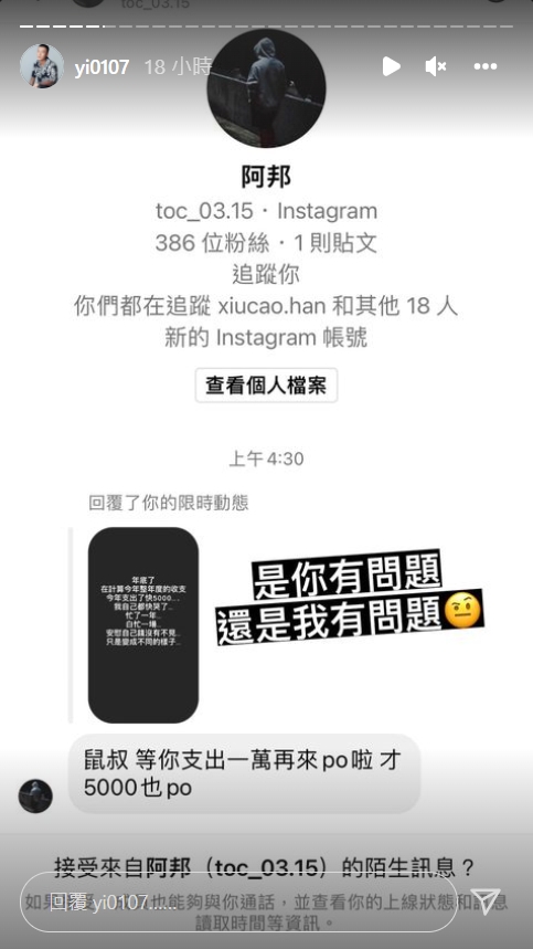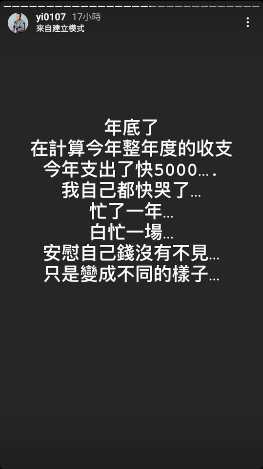 鳳梨最近在Instagram的限動中寫下,「年底了,在計算今年整年度的收支,今年支出了快5000……我自己都快哭了…忙了一年…白忙一場……」,驚人的開銷讓他感到挫折,他也感慨表示,「錢沒有不見,只是變成不同的樣子」。