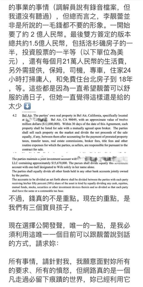 不僅如此,王力宏還提到,自己需要給李靚蕾每個月21萬人民幣(約91萬新台幣)的生活費,以及提供褓姆、司機、專車、傭人等,並讓母子可以在台北的房子免費住18年,「這些都是因為一直希望靚蕾可以舒服的過日子」。對於王力宏的指控,李靚蕾則是秀出相關文件證明自己的清白,她也解釋「贍養費的確一毛都沒拿,但洛杉磯的房子以及股票都是雙方『各自』擁有的財產,唯一有談到的費用只有小孩的生活費、教育費、不解雇現有員工及台北的房子」,對於王力宏將所有事情混為一談,讓她感到相當傻眼!如今,王力宏也公開聲明「將暫時退出演藝圈」,並爲自己的行為道歉,但外界依然不買單,認為他應該永遠退出,不要再出來了。