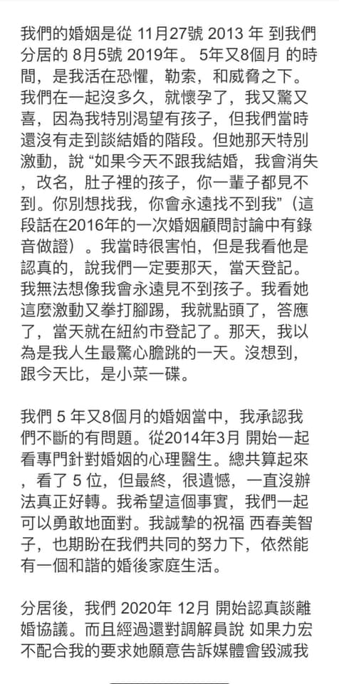 王力宏在貼文中表示,為了顧及李靚蕾的感受,但又不願遭到莫須有的指控,所以在發表聲明前他十分苦惱,「我真的不想傷害她,更不想傷害我們的孩子!他們都是我家人,我的全部,我的最愛」。他強調,「沒有對我們的婚姻不忠」,並透露這段期間「我活在恐懼、勒索,和威脅之下」,他進一步表示,當年李靚蕾懷孕時,對方威脅他如果不馬上結婚,便會帶著孩子永遠消失,甚至還對他拳打腳踢,讓他感到十分恐懼!