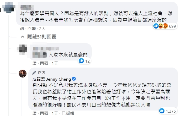 貼文一出,有酸民看到她打高爾夫球之後表示,「為什麼要學高爾夫?因為是有錢人的活動;然後可以進入上流社會,然後嫁入豪門⋯不要問我怎麼會有這種想法,因為電視節目都這麼演的!」而成語蕎看了忍不住回嗆,「不好意思,我家境本身就不差」、「我有自己的工作,不用一定要門當戶對也能過的很好喔!酸民不要用自己的想像力就亂黑別人喔!」