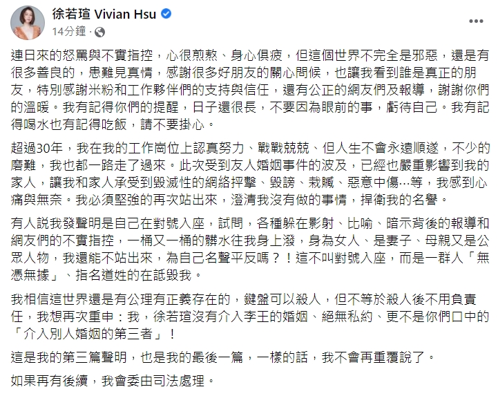 至於被外界冠上莫須有的罪名,她也嚴正的強調,「我,徐若瑄沒有介入李王的婚姻、絕無私約、更不是你們口中的『介入別人婚姻的第三者』!」並表示這是她最後一次對這件事情給予回應,如果有後續,將會交給司法處理。