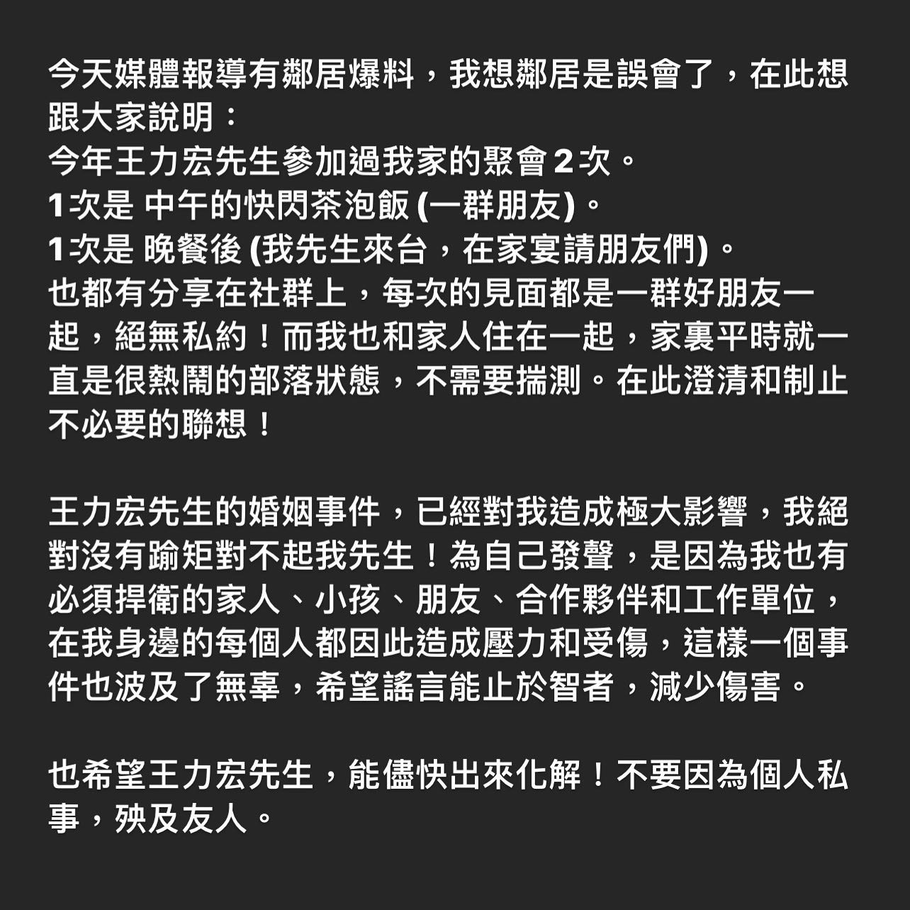 對此,有網友痛罵王力宏,「王力宏沒有幫無辜被牽扯的人澄清,而只顧到他自己止血,自私的行為很令人不齒」,也有人建議徐若瑄效仿陳建州夫婦,直接找李靚蕾代為澄清更乾脆,「叫李靚蕾出聲明還你清白嘛!她說一聲,好過你發幾次聲明啊!」、「自己當然要說沒有,一篇廢話,只要李短短一句話就可以澄清了,清清白白」、「真奇怪,為什麼就是不直接找李靚蕾澄清?這種文章,發一百次也不見得有用!」。