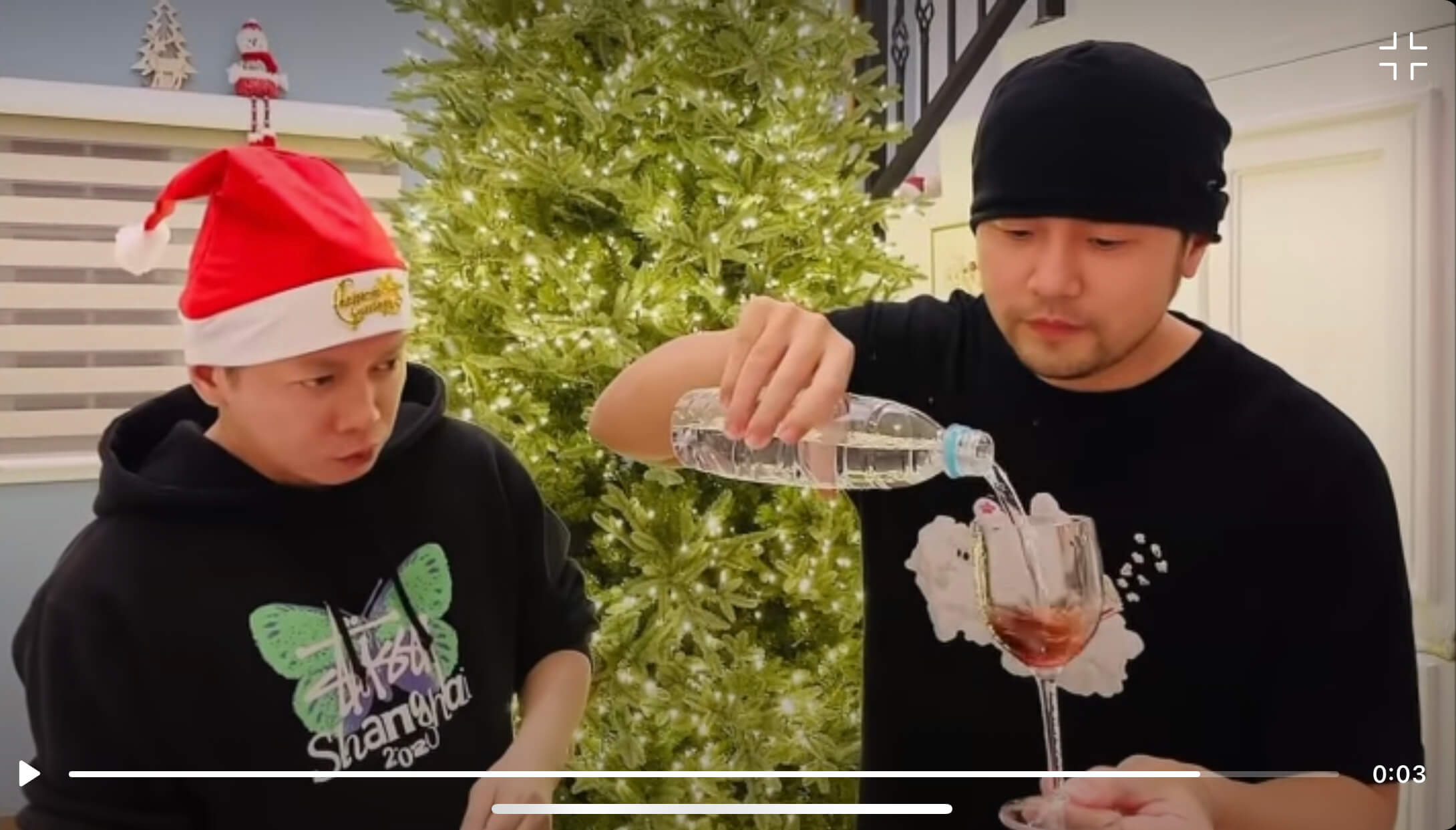 隨後,周杰倫馬上奪走酒杯,氣喊「我還沒講完啦」,並請好友給予一瓶寶特瓶罐裝水,表示「聖誕節要變一個聖誕的魔術給大家看」,他將手裡白開水倒進酒杯,下一秒瞬間變成紅酒,直呼「說紅酒,紅酒到」,而這一連串魔術,掀起眾人驚呼。