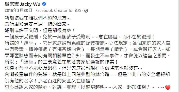 最近因為鹿希派的事情,讓吳宗憲再度成了大家關注的焦點,而他在2016年針對「小燈泡案」發表的個人觀點,也再度被網友們挖出來討論,其中他提到新加坡治安良好都要多虧於「鞭刑」,並且還提到「連坐法」存在的必要性,直指「各個家庭的家人當中有吸毒、精神疾病(有傷害傾向者)、長期無業(啃老)、或者毆打家人⋯如果隱匿狀態而未向有關相關單位告知,而發生不幸事件,才會施以連坐之懲罰!」如今網友看到這則貼文,狠酸吳宗憲不要空口說白話,「該和兒子一起示範連坐罰」、「爸爸沒教好嗎?」、「連坐的話全家都會受罰耶...」。