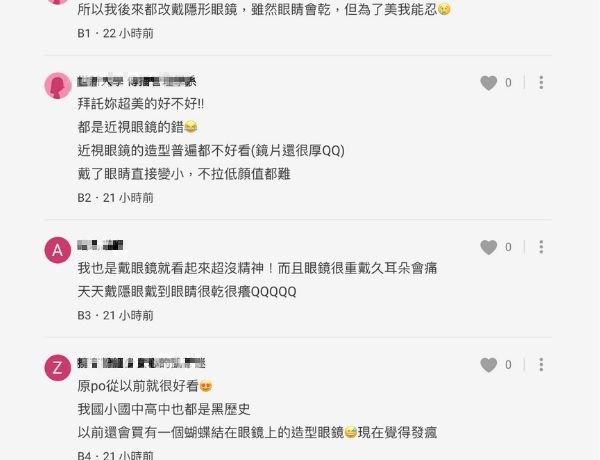 此文一出,激發近視仔們的共鳴,「後來都改戴隱形眼鏡,雖然眼睛會乾,但為了美我能忍。」、「我戴眼鏡的照片全銷毀了,通通都是黑歷史。」、「我近視真的超深,鏡片超厚超重,還會一直滑下來!」、「近視就是醜,還有各種生活麻煩」眾人一致認為:「長得歪都是近視眼鏡惹得禍!」也有人直言,摘下厚重鏡框就是最快的整型術!