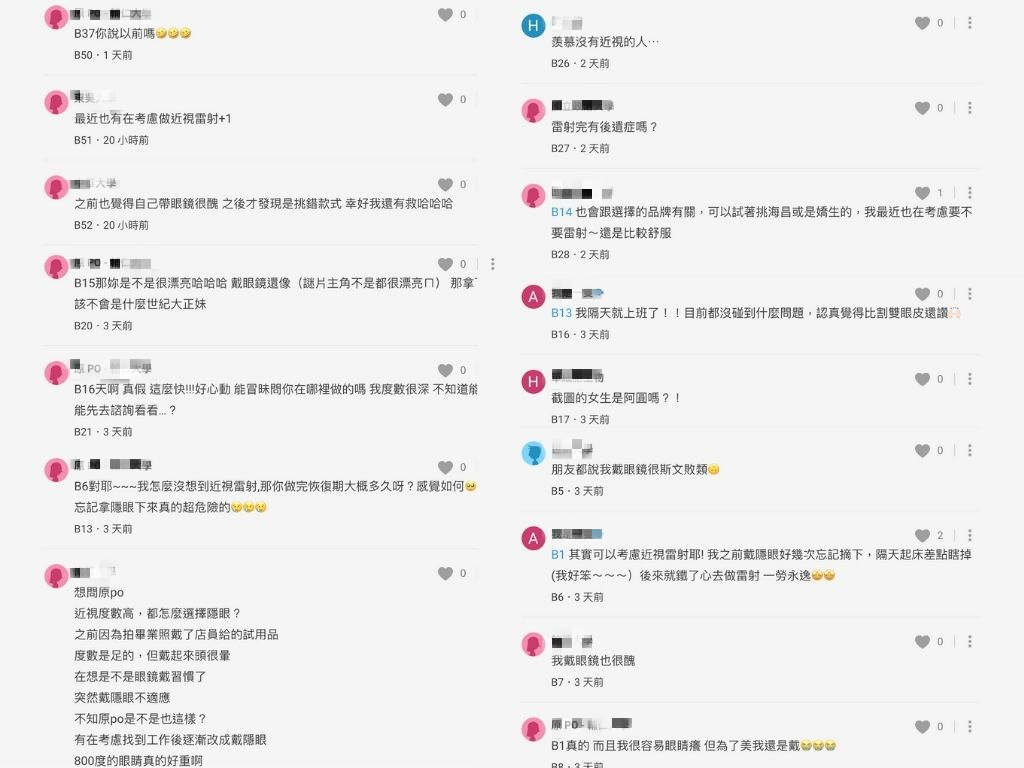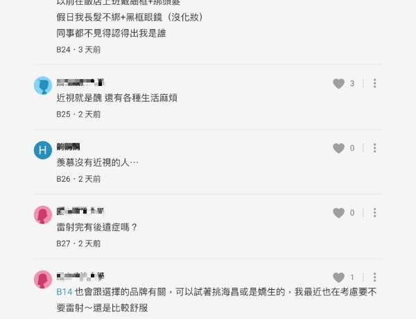 部分網友也對改善近視眼與近期盛行的雷射手術提出看法,「羨慕沒有近視的人⋯」、「我最近也在考慮要不要雷射~還是比較舒服」、「術後還有可能近視嗎?」、「度數很深的話適合做雷射嗎?」。近視雷射的過來人則出面表態,手術如今已相當純熟,且比起其他醫美更加值得投資。