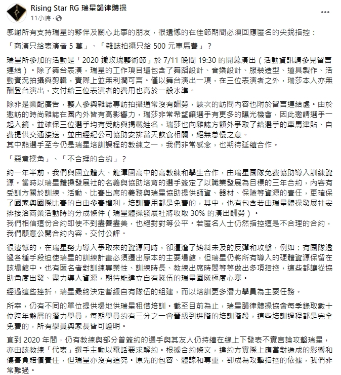 瑞星韻律體操協會29日凌晨在臉書上公開發表聲明,並針對延燒多時的指控一一回覆,關於「商演只給表演者5萬」一事,瑞星表示,協會的業務項目不只舞台表演,還包含舞蹈設計、音樂設計、服裝造型、道具製作、活動實況拍攝與剪輯,「實際上並無利潤可言」,而瑞莎本人是無酬登台,支付三位表演者的費用也高於一般水準!