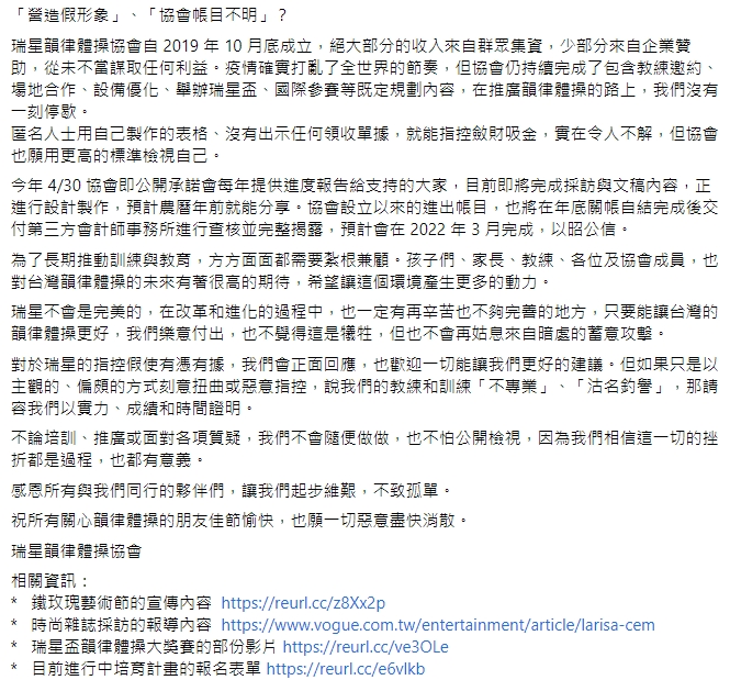 藝人瑞莎近年創立了「瑞星韻律體操協會」來培育台灣的體操選手,不過先前協會卻突然遭到爆料,被指控惡意挖角、帳款去向不明等問題,對此,瑞星韻律體操協會也在29日凌晨,針對外界的質疑一一解釋,聲明一出馬上引起各界熱烈關注與討論!