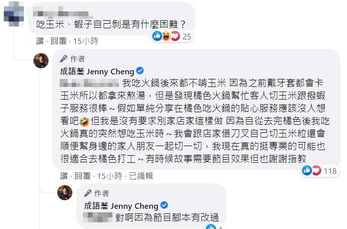 不過,有一次店家幫忙把玉米粒切下來後,連一部分的玉米梗都切進去,讓她大嘆,「那就沒有意義啦!」主持人小禎聽了忍不住吐槽,「妳本來要求這件事就很沒意義!」,節目播出後也馬上引起網友的批評聲浪。