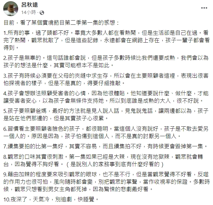 此外,呂秋遠似乎對李靚蕾的做法頗有微詞,「看了某個實境節目第二季第一集的感想」,他認為李靚蕾要適可而止,畢竟許多人都是在看熱鬧,但網路上的紀錄永遠都會存在,孩子一輩子都會看到。
