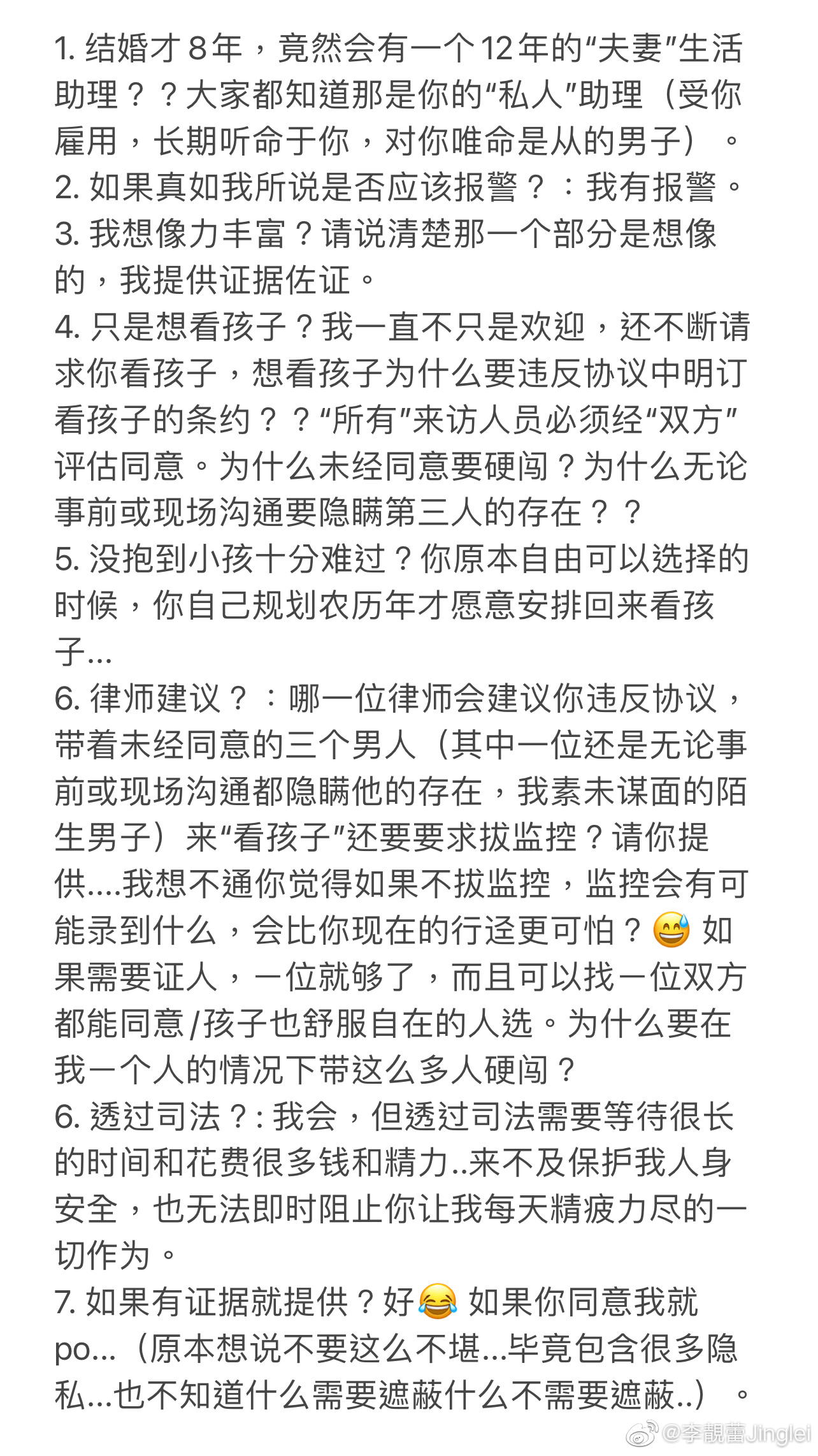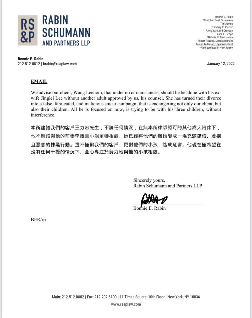 王力宏經紀公司稍早也貼出律師的會面建議聲明自證,「本所建議我們的客户王力宏先生,不論任何情況,在無本所律師認可的其他成人陪伴下他不應該與他的前妻李靚蕾小姐單獨相處。她已經將他們的離婚變成一場充滿錯誤、虛構且惡意的抹黑行動。這不僅對我們的客戶,更對他們的小孩,造成危害。他現在僅希望在沒有任何干擾的情況下,全心專注於努力地與他的小孩相處」。